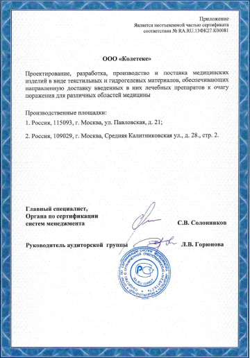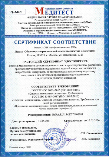 ООО «Колетекс» получило сертификат №RA.RU. 13ФК27. К00081. Настоящий сертификат удостоверяет: система менеджмента качества применительно к проектированию, разработке, производству и поставке медицинских изделий в виде текстильных и гидрогелевых материалов, обеспечивающих направленную доставку введенных в них лечебных препаратов к очагу поражения для различных областей медицины соответствует требованиям ГОСТ ISO 9001-2015(ISO 9001:2015) и ГОСТ ISO 13485-2017(ISO 13485:2016).