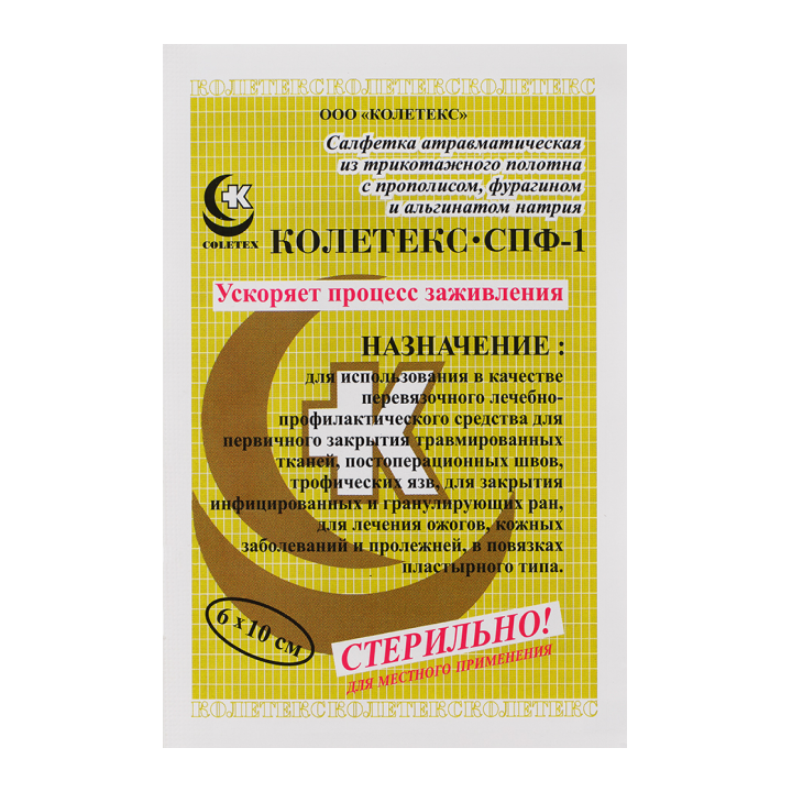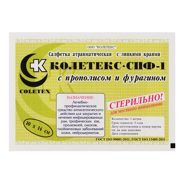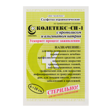 Способ примененияПри всех видах указанной патологии салфетка «Колетекс с прополисом и фурагином» может находиться на раневой поверхности до 48–72 часов. Его смена производится через 1–3 сут. По показаниям – чаще (при полном пропитывании салфетки раневым отделяемым).